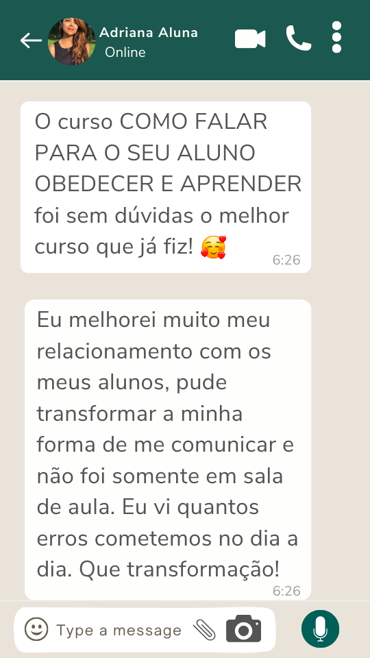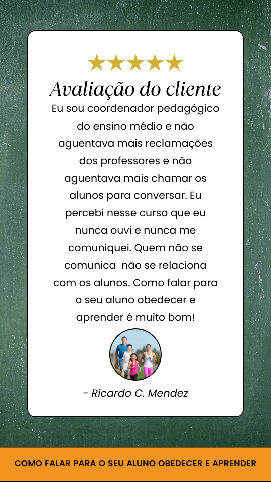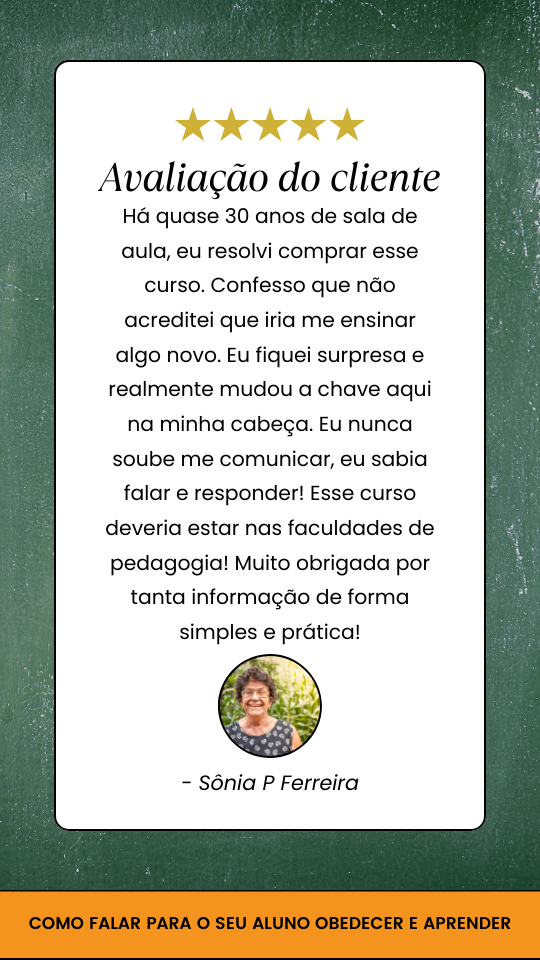 O curso Como falar para o seu aluno obedecer e aprender foi elaborado para professoras que estão cansadas de chegarem exaustas e sem voz em casa que buscam mudanças em sala de aula. Ou seja, nada mais e nada menos que diminuir a indisciplina e passar o excelentíssimo conteúdo pedagógico.